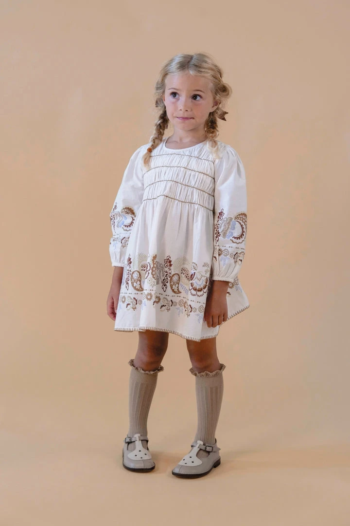 A beloved Apolina style, the Kari dress returns in a striking multi-coloured floral border print, inspired by vintage Russian folk scarves. The intricate hand-smocked chest releases to a full silhouette skirt with a cute, swingy style. The folk floral border print to hem and cuffs lends Kari a sweet bohemian mood. Invisible zip closure to back. Perfect just to pair with sandals or layered up with contrasting knits.