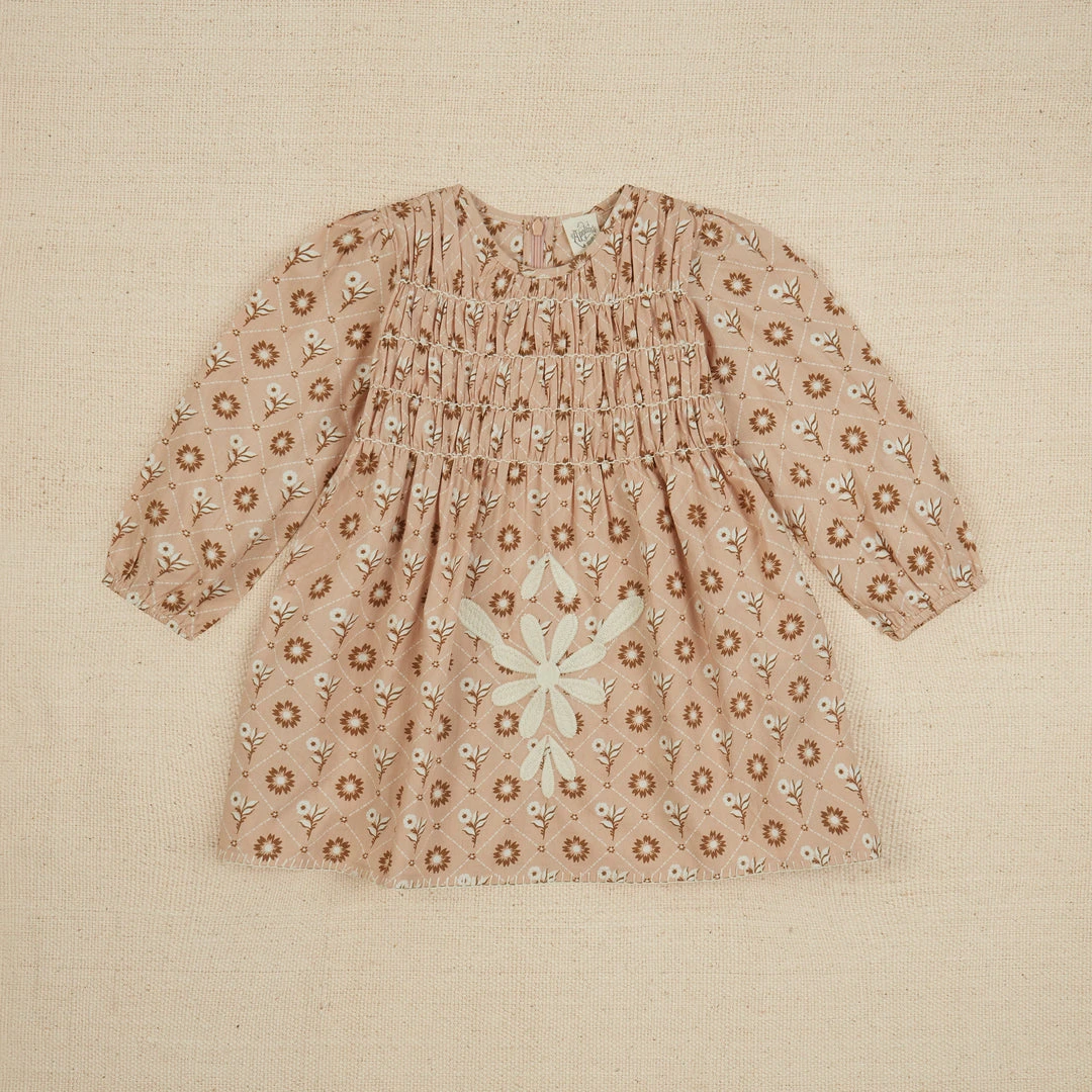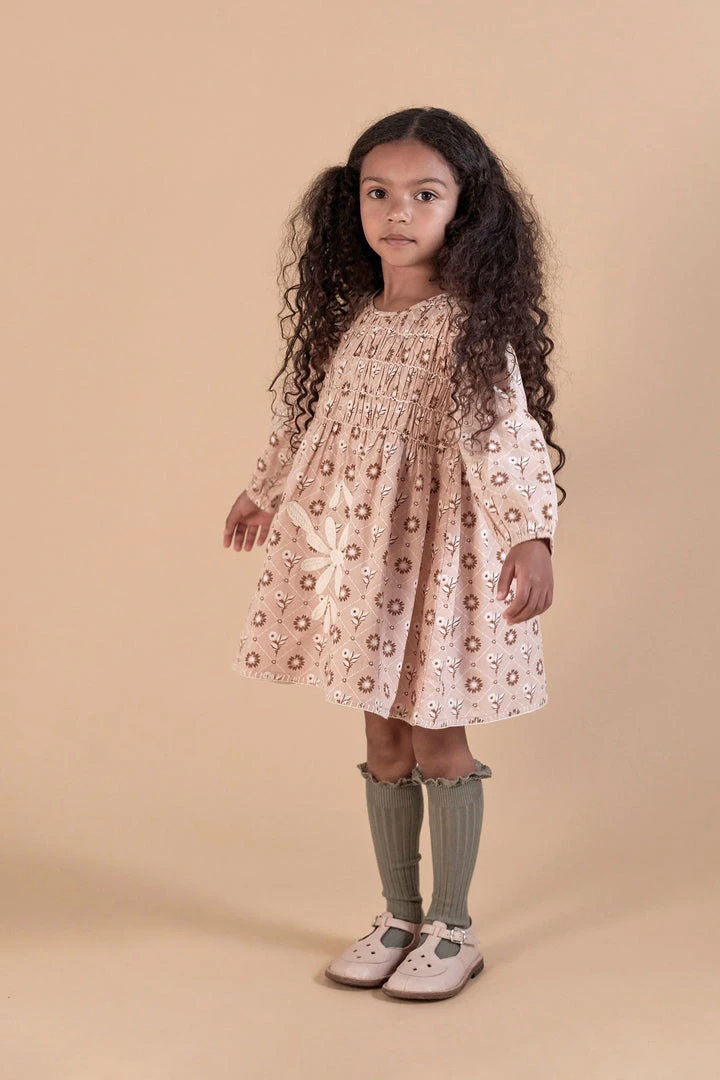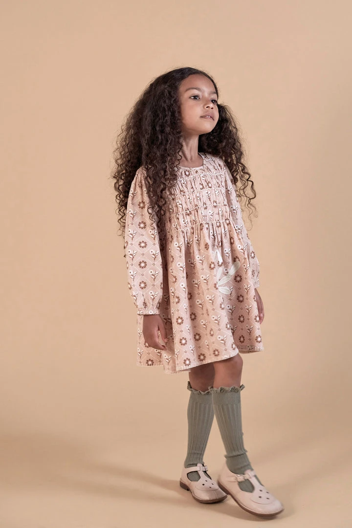 A beloved Apolina style, the Kari dress returns in a folk-inspired loaf tin floral print. The intricate hand-smocked chest releases to a full silhouette skirt with a cute, swingy style. Floral embroidery in cream sits sweetly against the vintage peach-toned base. Invisible zip closure to back.
