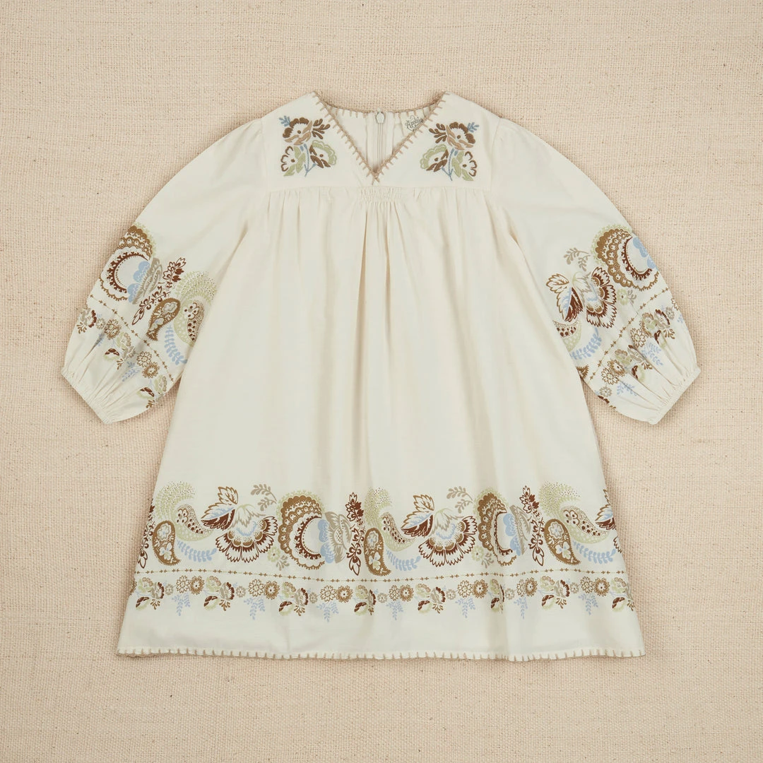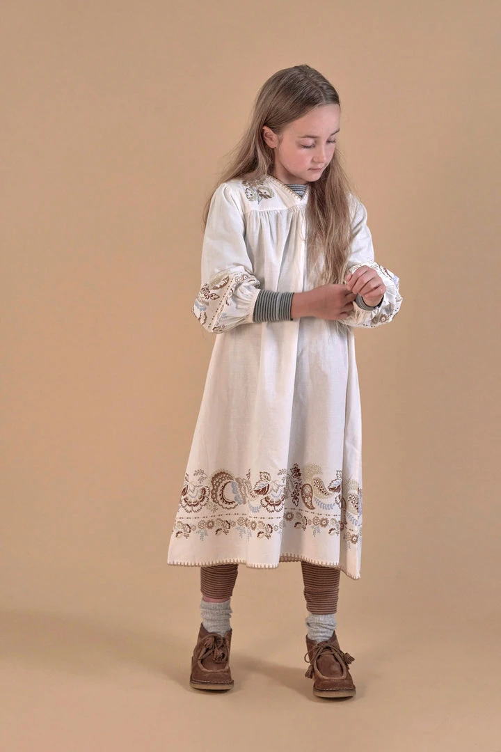 The new Willow midi dress returns to Apolina’s original inspiration, the bohemian styles of the ‘60s and ‘70s. With her volume sleeve and dramatic vintage-inspired folk border print, Willow is a statement dress with a dreamy vibe. Finished with a subtle embroidery to the chest, intricate crochet trim at neckline, and hand blanket stitch at hem. Invisible zip closure to back. Intended to hit mid-calf.