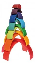 This Rainbow tunnel is really versatile! Children can stack and sort or they will use it as a cradle for dolls, as fence for animals, like a tunnel or bridge for vehicles, as a house for dwarfs and dollhouse dolls and build amazing sculptures… this rainbow will always be integrated in playing with a lot of fantasy.