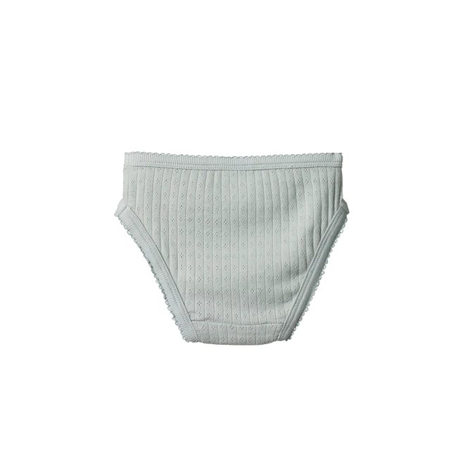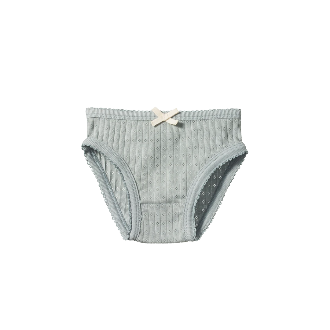 A classic style underpant in beautiful organic cotton pointelle fabric. The delicate open weave has a nostalgic quality and is super soft and stretchy. Comfortable with a soft elastic waistband, cotton picot stitching around legs and a sweet bow at waist.